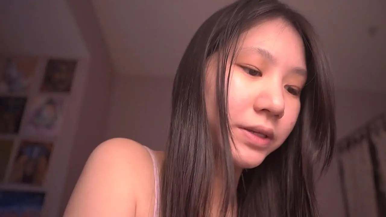 Cute, innocent Asian girl reads aloud from a book in her native Chinese, her voice triggering ASMR sensations. She has a beautiful smile and is the embodiment of goodness. The scene is quiet and intimate, with the focus on her pretty face and gentle mannerisms.
