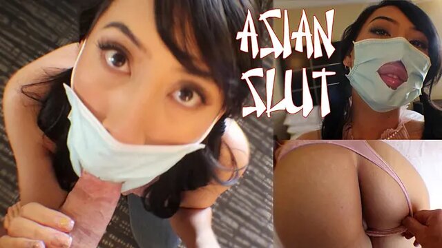 Sexy petite Asian girl with pigtail slobbers on his cock through a mask. She gives a sloppy head and swallows his cum.