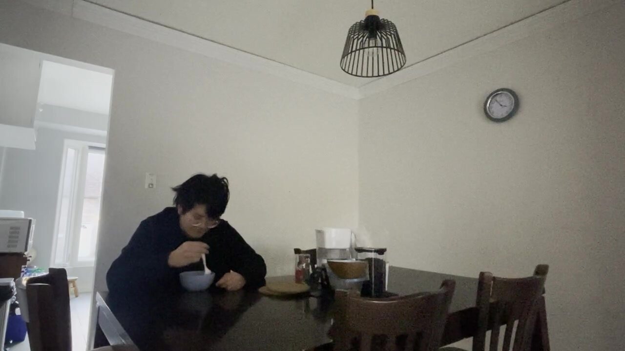 Unhappy Asian teenager cries while eating cereal alone in the dark,